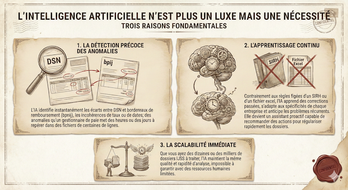 2. L’apprentissage continu : Contrairement aux règles figées d’un SIRH ou d’un fichier excel, l’IA apprend des corrections passées, s’adapte aux spécificités de chaque entreprise et anticipe les problèmes récurrents. Elle devient un assistant proactif capable de recommander des actions pour régulariser rapidement les dossiers.